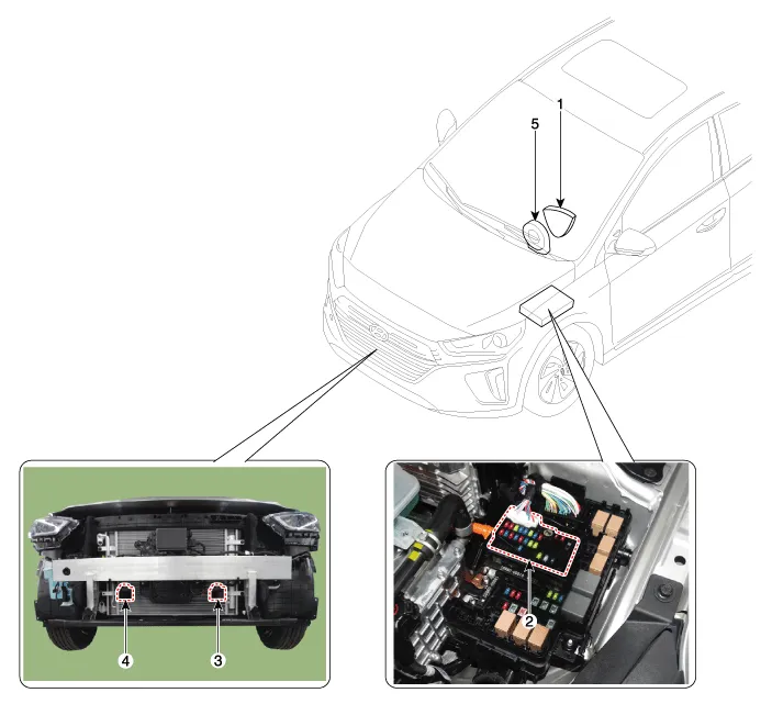 | 1. Horn switch 2. Horn relay (Built - in PCB Block) 3. Horn (Low) | 4. Horn (High) 5. Clock spring |
