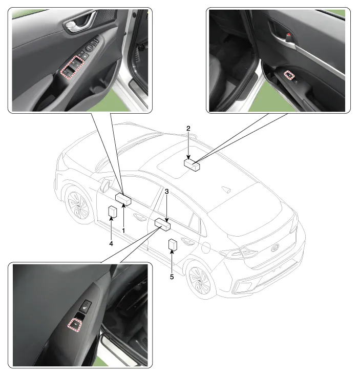 | 1. Driver power window switch 2. Assist power window switch 3. Rear power window switch | 4. Front window motor 5. Rear window motor |