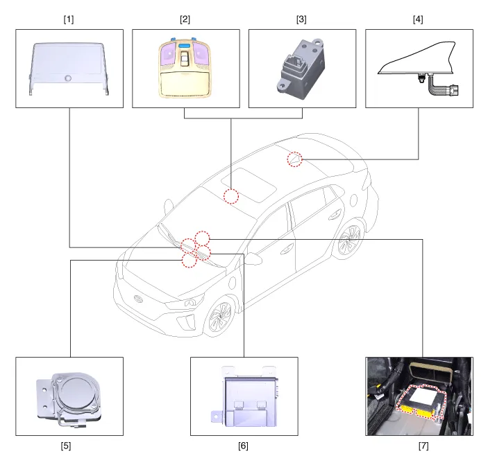 | 1. Head unit (AVN) 2. Emergency call system button 3. Emergency call system MIC 4. Roof antenna | 5. Emergency call speaker 6. Emergency call unit 7. Supplemental Restraint System Control Module (SRSCM) |
