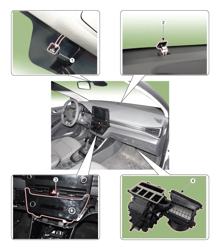 | 1. Auto defogging sensor 2. Photo sensor | 3. Heater & A/C control unit 4. Heater & Blower unit |