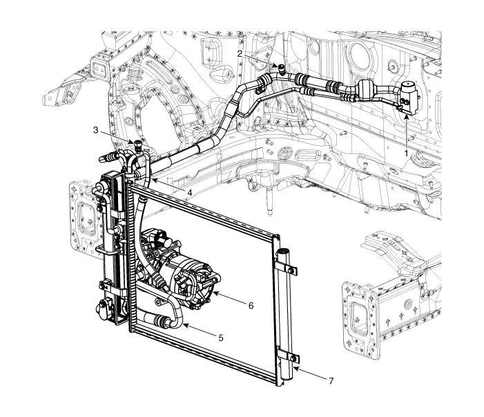 | 1. Expansion valve 2. Service port (Low pressure) 3. Service port (High pressure) 4. Discharge hose | 5. Suction & Liquid tube assembly 6. Electric A/C compressor 7. Condenser |