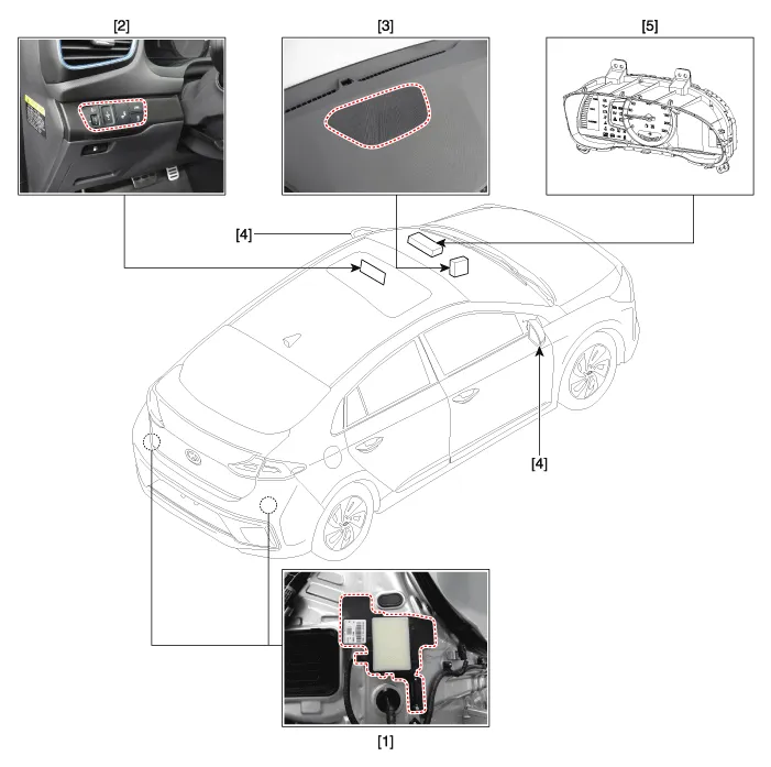 | 1. Rear Corner Radar Unit 2. Rear Corner Safety ON/OFF Switch 3. Speaker | 4. Warning Indicator 5. Cluster |