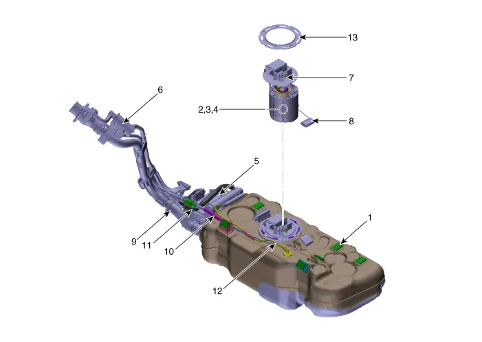 | 1. Fuel tank 2. Fuel pump 3. Fuel filter 4. Fuel pressure regulator 5. Canister 6. Fuel tank air Filter 7. Fuel pressure sensor (FPS) | 8. Fuel level sensor (FLS) 9. Fuel Filler hose 10. Leveling hose 11. Vent hose 12. Vapor tube 13. Fuel pump plate cover |