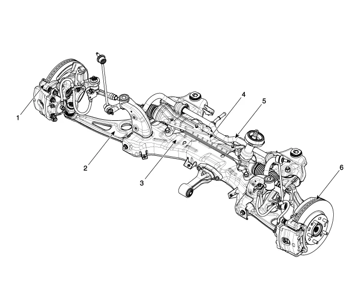 | 1. Brake caliper 2. Lower arm 3. Sub frame | 4. Steering gearbox 5. Stabilizer bar 6. Brake disc |