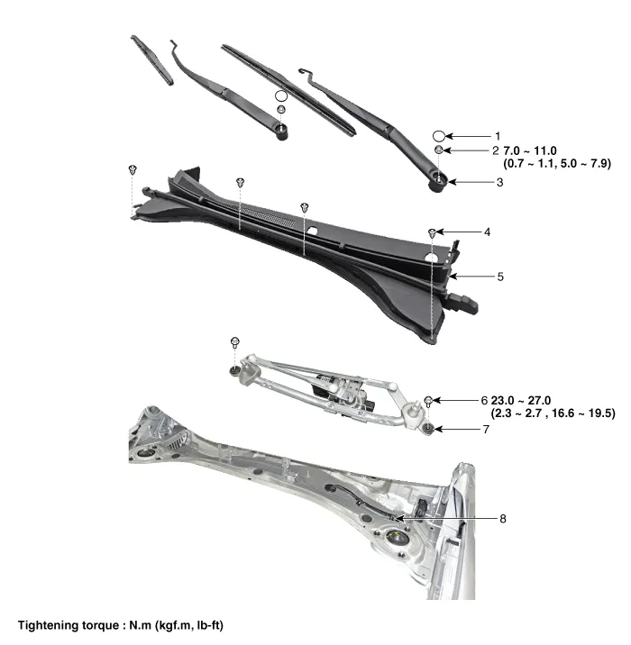 | 1. Cap 2. Nut 3. Wiper arm & blade 4. Rivet | 5. Cowl top cover 6. Bolt 7. Wiper motor & linkage assembly 8. Wiper motor connector |