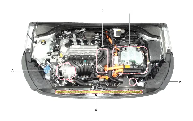 | 1. HPCU (Hybrid Power Control Unit) (LDC+MCU+HCU+Reservoir) 2. Hybrid drive motor | 3. Hybrid starter generator (HSG) 4. Electrical radiator 5. Electric water pump (EWP) |