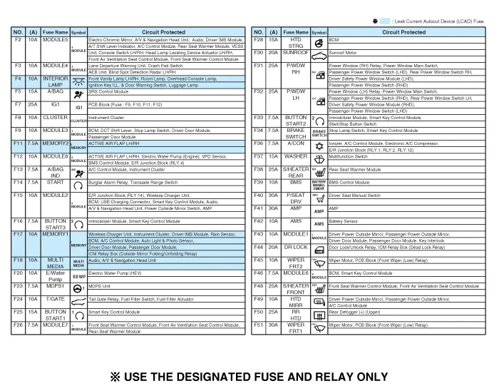 DescriptionAuto Cut System of Dark Current Abbreviation Expalnation AAFActive Air FlapACUAirbag Control UnitAEBAutonomous Emergency BrakingAHBActive Hybrid Brake SystemAMPAmplifierAVNHead Unit (Audio / AVN)B_CANBody Controller Area NetworkBCMBody Control ModuleBMSBattery Management SystemBSDBlind Spot DetectionC_CANChassis Controller Area NetworkCARMERARear View CarmeraCLUCluster ModuleDATCDual Automatic Temp ControlFPCMFuel Pump Control ModuleHPCUHybrid Power UnitIGPMIntergrated Gateway & Power control ModuleLDWSLane Departure Warning SystemM_CANMulti media Controller Area NetworkMDPSMotor Driven Power SteeringP_CANPowertrain Controller Area NetworkPASParking Assist SystemSJBSmart Junction BlockSMKSmart Key UnitTCM(DCT)Double Clutch Transmission UnitVESSVirtual Engine Sound SystemSmart Junction Block (SJB) General function : Interior Junction Block + some functions of BCMIt controls loads with CAN communication and IPS.