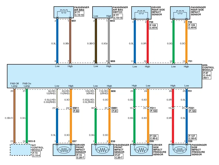 Components1. Supplemental Restraint System Control Module (SRSCM)2. Pressure Side Impact Sensor (P-SIS)3. Front right Pressure Impact Sensor (FIS)4. Front left Pressure Impact Sensor (FIS)5.