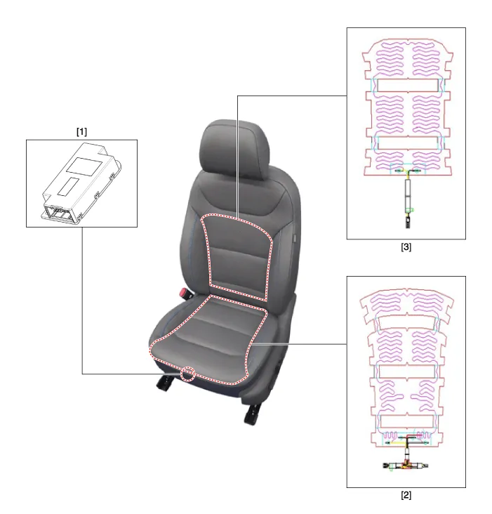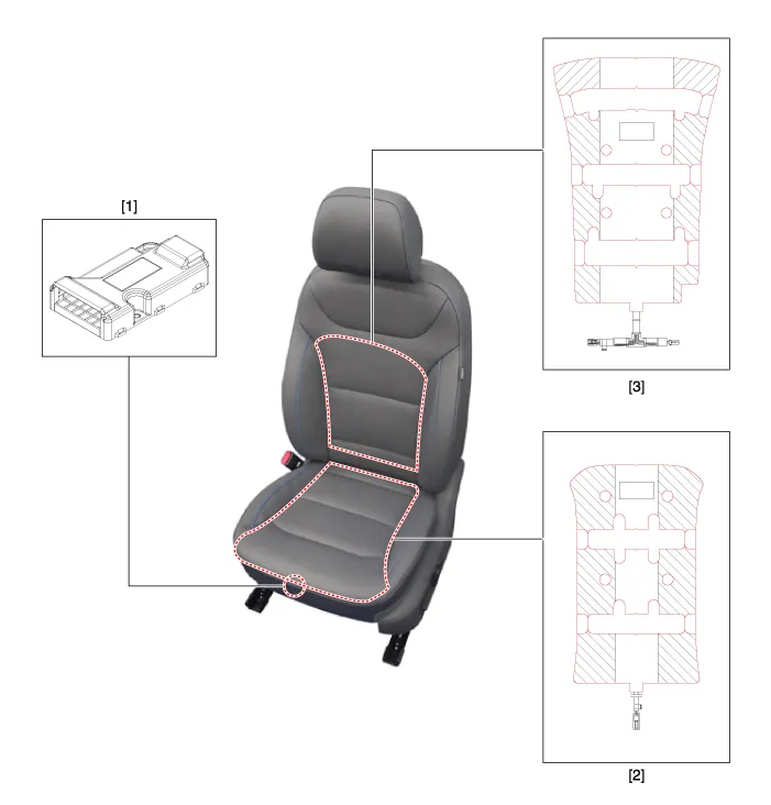 | 1. Air ventilation unit (Passenger seat only) 2. Seat cushion (Heater) | 3. Seat back (Heater) |