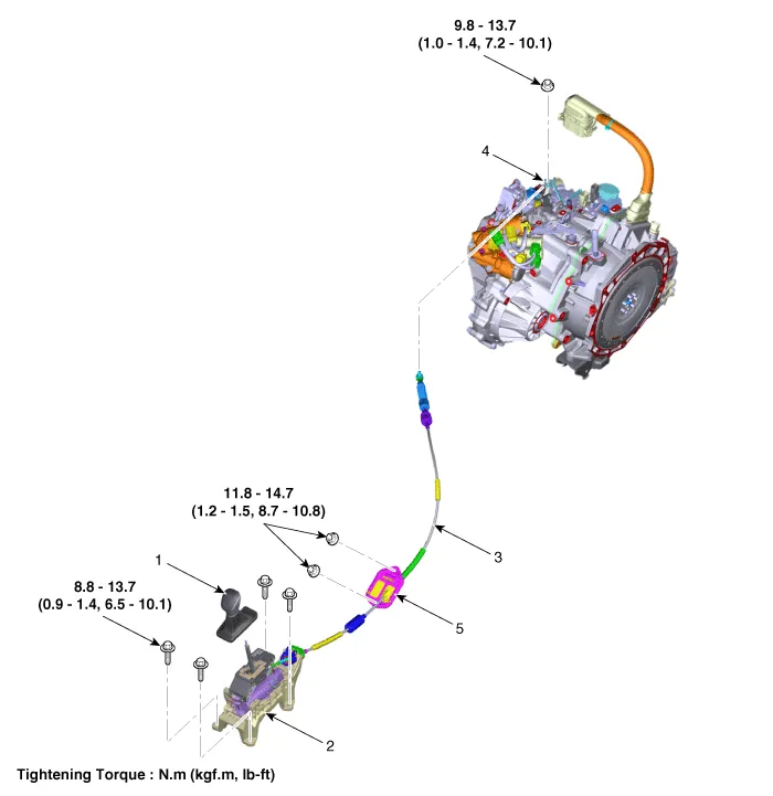 | 1. Shift lever knob & boots assembly 2. Shift lever assembly 3. Shift cable | 4. Manual control lever 5. Shift cable retainer |
