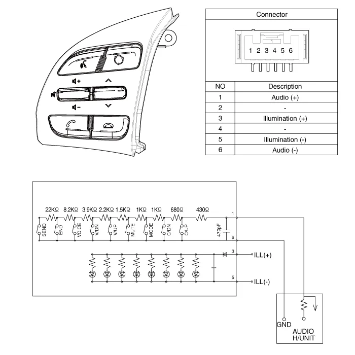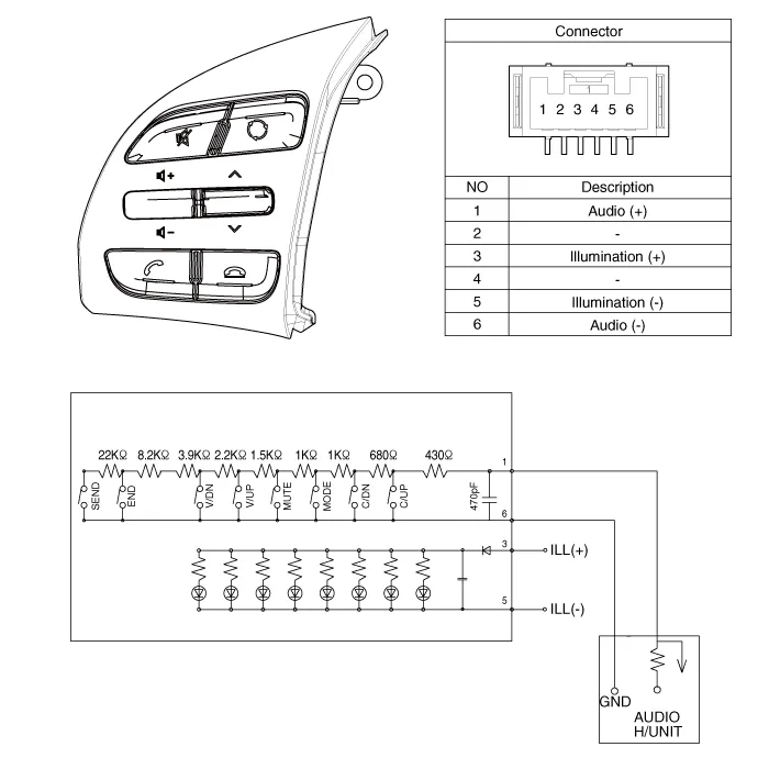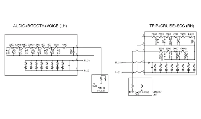 Inspection1.Check for resistance between terminals in each switch position (LH).[LH : Audio+B/TOOTH+VOICE] Switch Connector terminal Resistance (±5%) SEEK Up1-6430 ΩSEEK Down1.