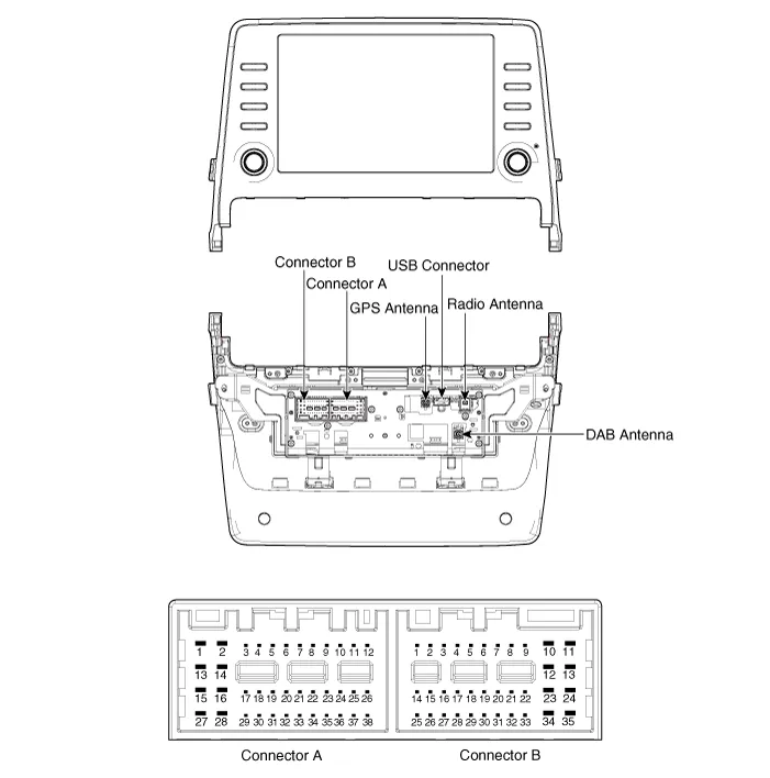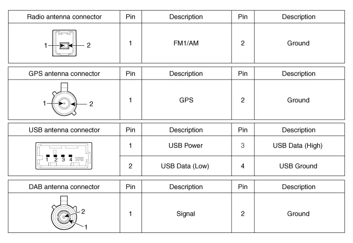 Component Location1. Audio unit2. Antenna feeder cable connector3. Roof antenna (Audio)4. Front door speaker5. Rear door speaker6. Antenna feeder cable7.