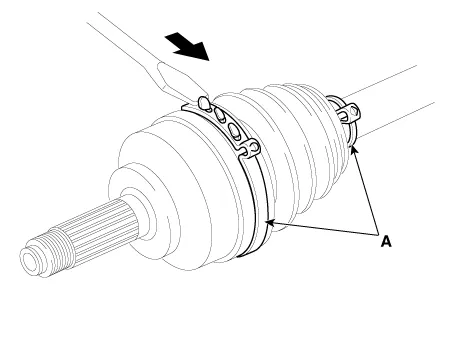 | 3. | Using a plier or flat-tipped (-) screwdriver, remove the BJ boot bands (A).