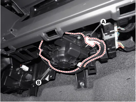 | 3. | Disconnect the blower motor connector (A) and then remove the blower motor (B) after loosening the screws.