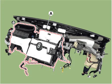 | 30. | Remove the heater and blower unit (A) from the crash pad after loosening the mounting nuts.