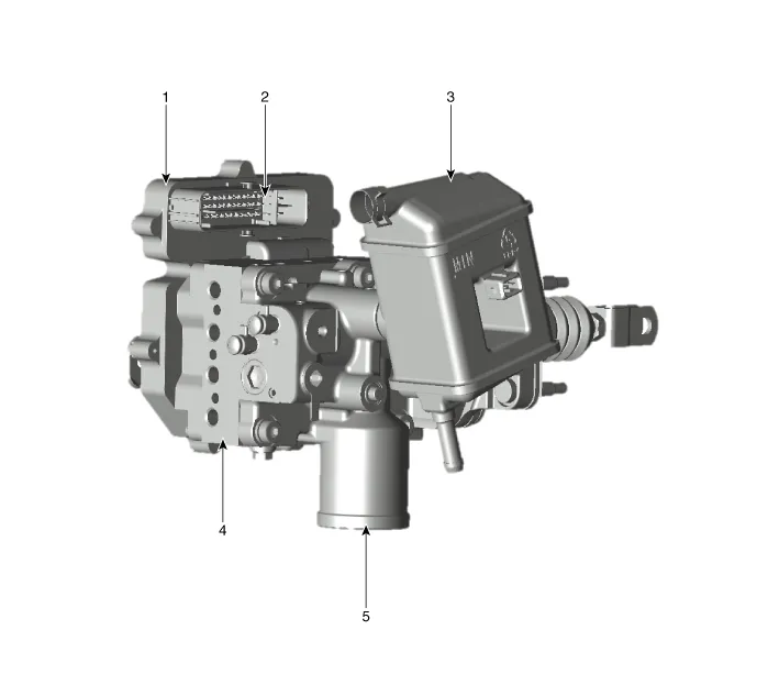 | 1. Intergrated Brake Actuation Unit (IBAU) ECU 2. Intergrated Brake Actuation Unit (IBAU) connector 3. Reservoir | 4. Intergrated Brake Actuation Unit (IBAU) 5. Pedal simulator |