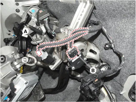 | 4. | Disconnect the stop lamp switch connector (A) and the brake pedal stroke sensor connector (B).