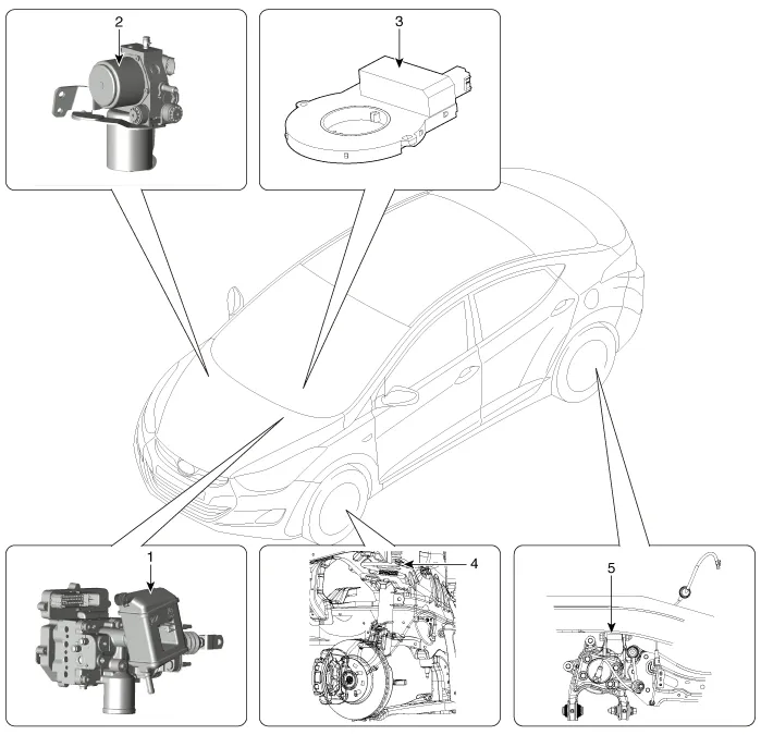 | 1. IBAU (Intergrated Brake Actuation Unit) 2. Pressure Source Unit (PSU) 3. Steering angle snesor | 4. Front wheel speed sensor 5. Rear wheel speed sensor |