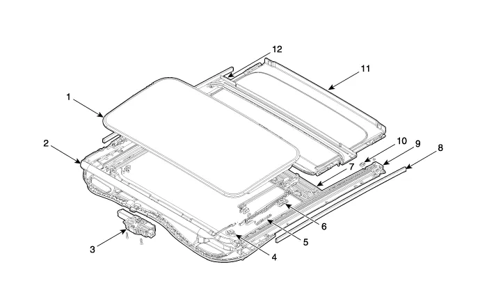 | 1. Glass panel assembly 2. Deflector 3. Motor assembly 4. Spring base assembly 5. Seth plate assembly 6. Guide assembly | 7. Frame sub assembly 8. Seal tape 9. Rear drip 10. Stopper 11. Sunshade assembly 12. Drip rail assembly |