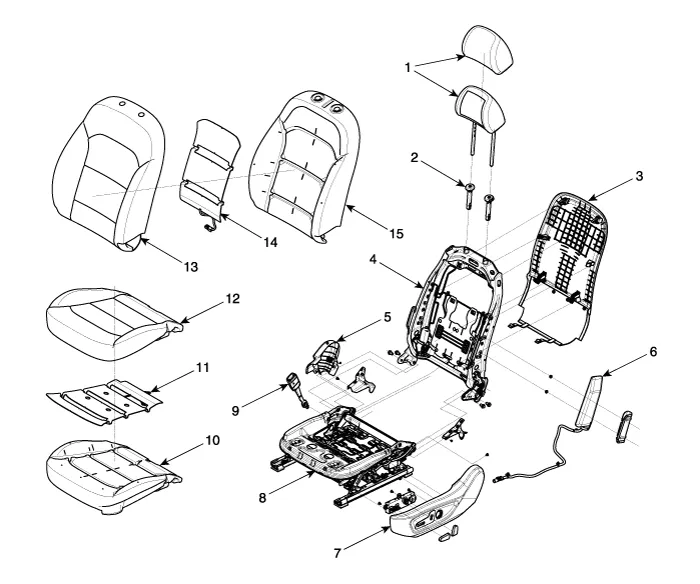 | 1. Front seat headrest 2. Front seat headrest guide 3. Front seat back board 4. Front seat back frame assembly 5. Front seat shield inner cover 6. Front seat SAB module 7. Front seat shield outer cover 8. Front seat cushion frame assembly | 9. Front seat belt buckle 10. Front seat cushion pad 11. Front seat cushion heater mat 12. Front seat cushion cover 13. Front seat back cover 14. Front seat back heater 15. Front seat back pad |