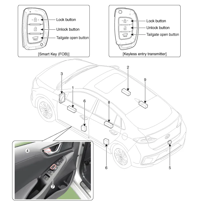 | 1. DDM (Driver Door Module) 2. ADM (Assist Door Module) 3. SJB (Smart Junction Block) 4. Door lock knob 5. Tailgate lid actuator | 6. Door latch module 7. Door lock/unlock switch 8. RLDM (Rear Left Door Module) 9. RRDM (Rear Right Door Module) |