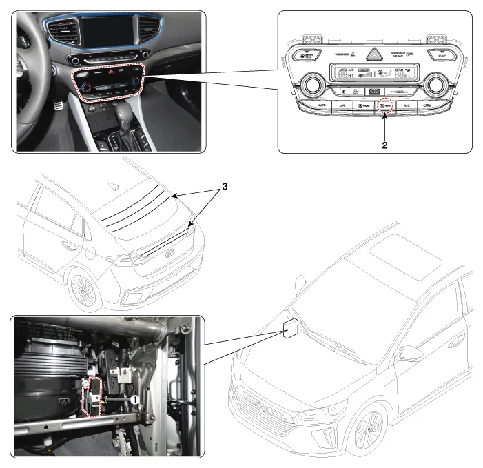 | 1. Body control module (BCM) 2. Rear glass defogger switch | 3. Rear glass defogger |