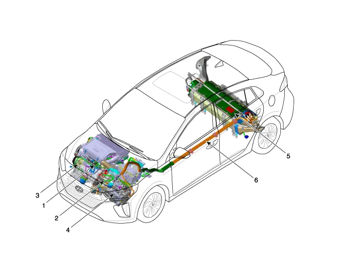 | 1. Engine 2. Hybrid Drive Motor 3. HSG (Hybrid Starter Generator) | 4. Transaxle 5. High Voltage Battery System 6. Power Cable |