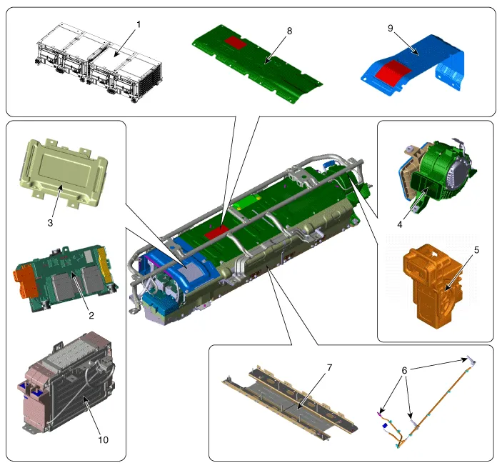 | 1. High Voltage Battery Module 2. Power Relay Assembly (PRA) 3. BMS 4. Cooling Fan 5. Safeety Plug | 6. Battery Temperature Sensor 7. High Voltage Battery Plate 8. High Voltage Battery Front Cover 9. High Voltage Battery Rear Cover 10. Auxiliary 12V Battery |