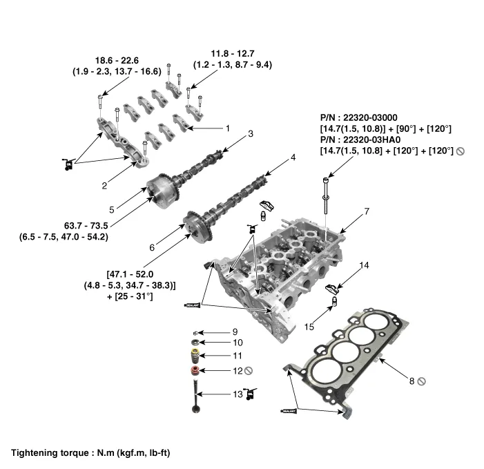 | 1. Camshaft bearing cap 2. Front camshaft bearing cap 3. Exhaust camshaft 4. Intake camshaft 5. Exhaust CVVT assembly | 6. Intake CVVT assembly 7. Cylinder head assembly 8. Cylinder head gasket 9. Retainer lock 10. Retainer | 11. Valve spring 12. Valve stem seal 13. Valve 14. Swing arm 15. Hydraulic lash adjuster (HLA) |