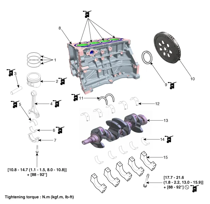 | 1. Piston ring 2. Piston 3. Piston pin 4. Connecting rod 5. Connecting rod upper bearing | 6. Connecting rod lower bearing 7. Connecting rod cap 8. Cylinder block 9. Rear oil seal 10. Flywheel | 11. Thrust bearing 12. Main bearing (Upper) 13. Crankshaft 14. Main bearing (Lower) 15. Main bearing cap |