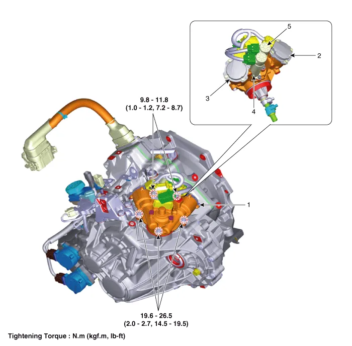 | 1. Gear actuator assembly 2. Shift motor (Even) 3. Shift motor (Odd) | 4. Select solenoid (Even) 5. Select solenoid (Odd) |