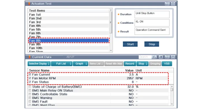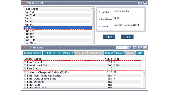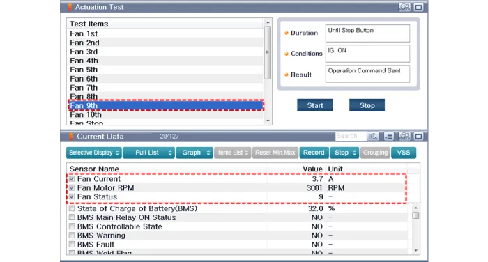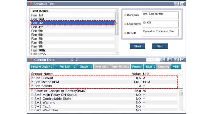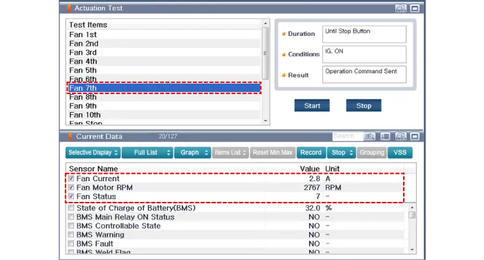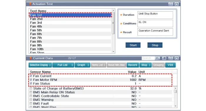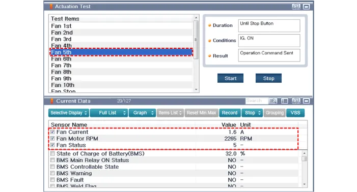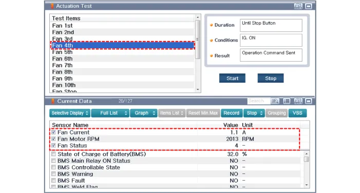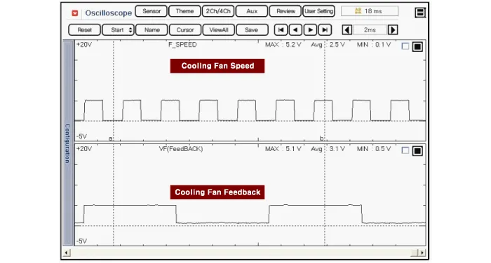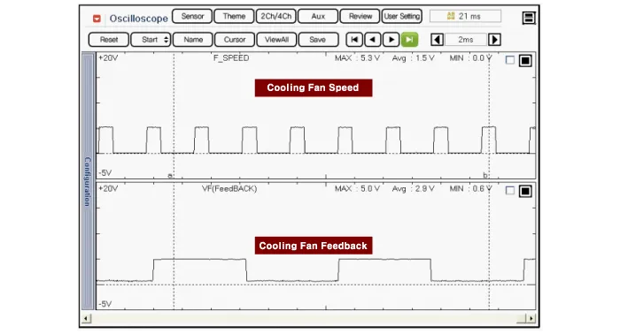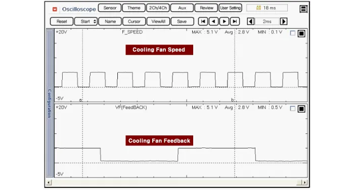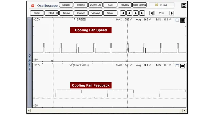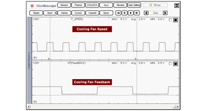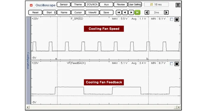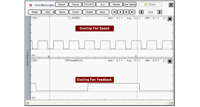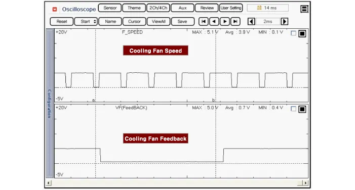 | 4. | Check "Fan Status", "Current" "Waveform" and waveforms in each cooling fan operation mode by using "Actuation Test" function in GDS.