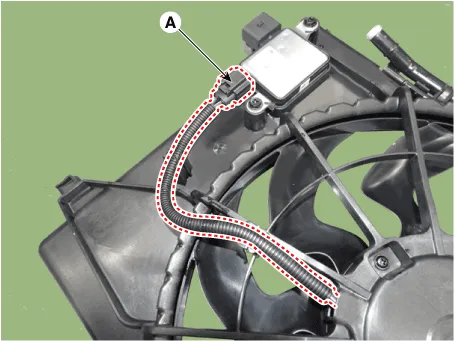 | 2. | Disconnect the fan motor connector (A) from the cooling fan controller (PWM).