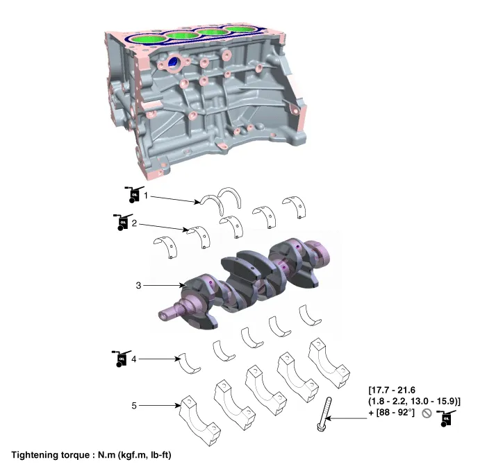 | 1. Thrust bearing 2. Main bearing (Upper) 3. Crankshaft | 4. Main bearing (Lower) 5. Main bearing cap |