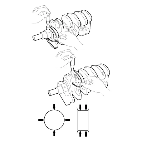 | 3. | Inspect the crankshaft main journals and pin journals. Using a micrometer, measure the diameter of each main journal and pin journal.