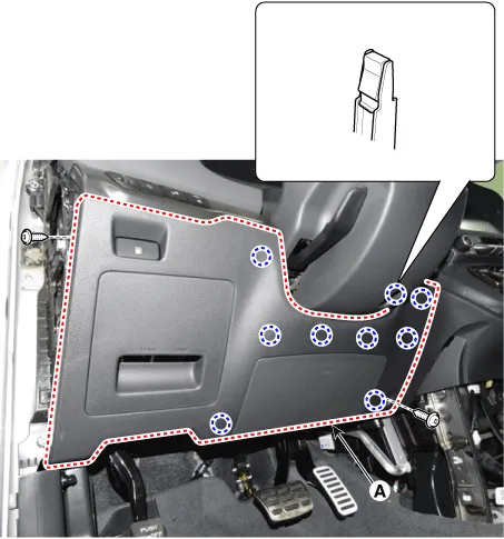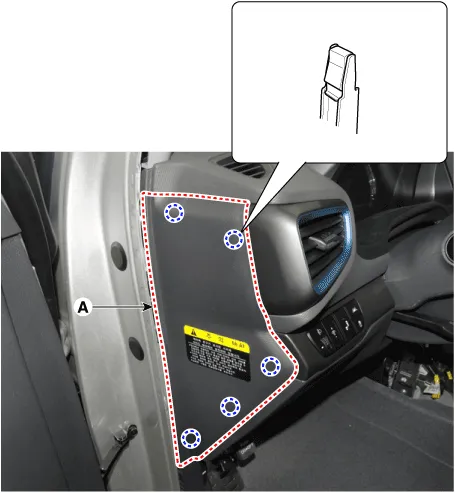 | 1. | Using a remover and remove the crash pad side cover [LH] (A).