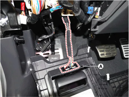 | 2. | Loosen the mounting screws and remove the crash pad lower panel (A).