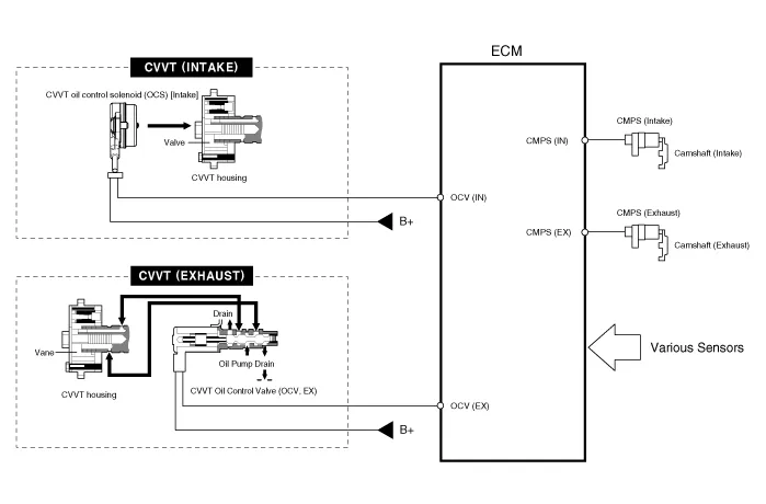| – | the CVVT Oil Control Valve (OCV) which supplies the engine oil to the cam phaser or runs out the engine oil from the cam phaser in accordance with the ECM PWM (Pulse With Modulation) control signal, |