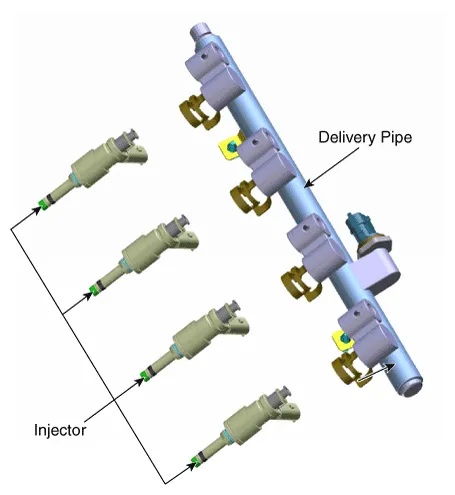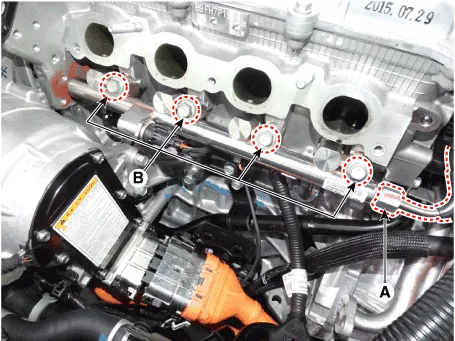 | 5. | Remove the delivery pipe and injector assembly from the engine after loosening the mounting bolts (B).
