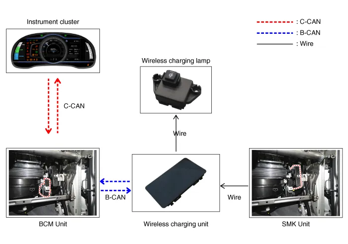 | 5. | SMK unit LF frequency interference prevention This function prevents interference between the wireless charging frequency and smart key unit frequency band. | (1) | Wireless charging is stopped when the door is open or the SMK unit is in LF mode (searching for smart key). e.g. Wireless charging function is stopped if the driver carries the smart key out of the vehicle during IG ON.