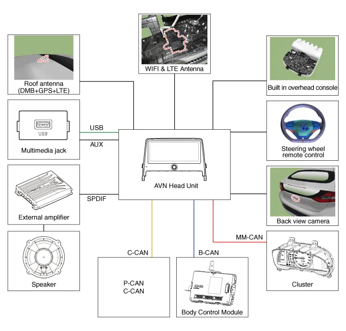 Component Location1. AVN head unit2. External amplifier3. Roof antenna4. USB jack5. Wifi & LTE Antenna6. Steering wheel remote control7. Hands-free mic (Built-in overhead console)