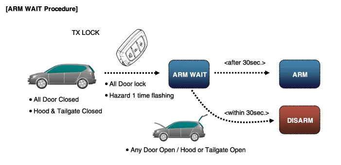 | | 1) | In "DISARM" state, no vehicle start inhibition. So, when door, hood, or Tailgate is opened, there is no alarm sound and flashing. |