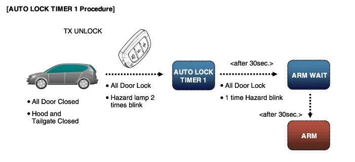 | 3) | B/A state changes to "PREARM" when "30sec." timer expired in"AUTOLOCKTIMER2"with Hood or Tailgate Open |
