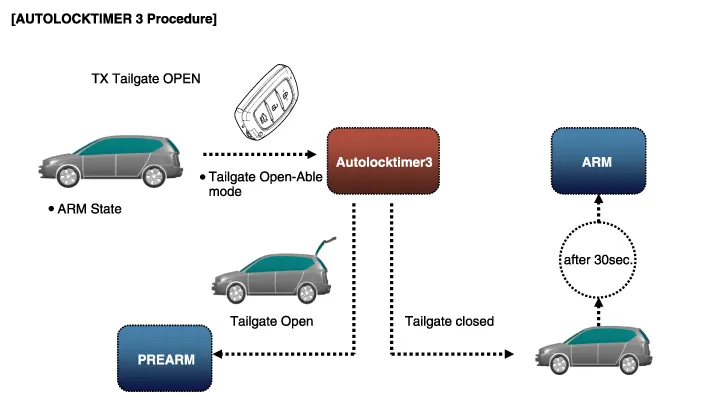 | 4) | In "AUTOLOCKTIMER3" state, timer "30sec." timer is running. If this timer expired, state transits to "PREARM" state with Tailgate Open. |