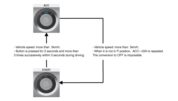 | The engine is off and returned to the ACC state when the button is pressed for 2 seconds and more than 3 times successively within 3 seconds during driving. The restarting is available for next 30 seconds regardless of FOB key and the electric power is changed through OFF → ACC→IGN→OFF by pressing the button without stepping on the brake (or with stepping on the brake) inside the car with FOB key. (However, when it is not in P position, ACC↔IGN is repeated. The conversion to OFF is impossible.) |