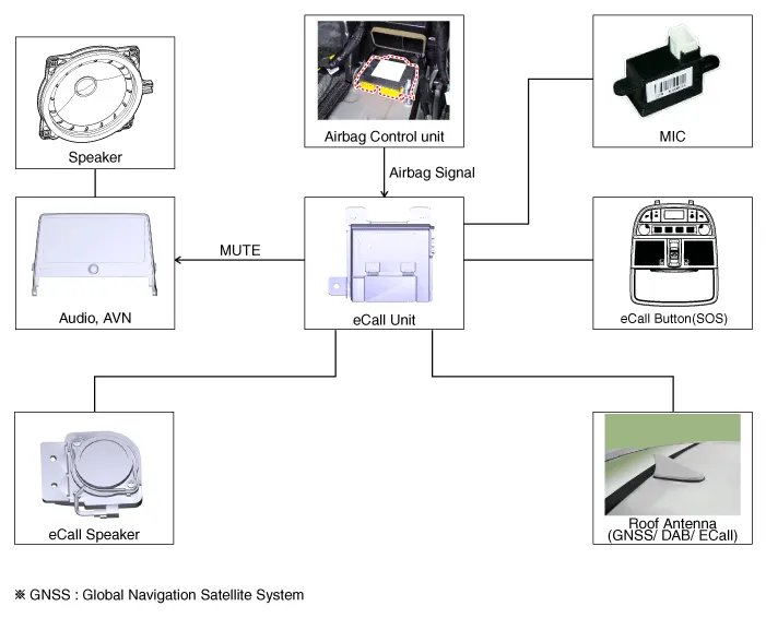 Components1. Head unit (AVN)2. Emergency call system button3. Emergency call system MIC4. Roof antenna5. Emergency call speaker6. Emergency call unit7.