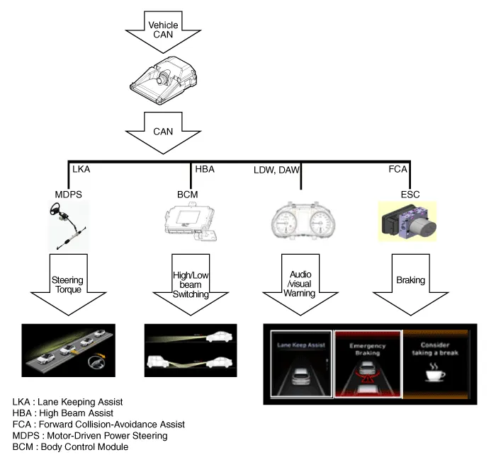 | 3. | Forward Collision-Avoidance Assist(FCA) : It warns the driver of risk and controls the braking of the vehicle to prevent collision with front obstacle during driving. (If Sensor Fusion FCA is equipped) THE MFC transmits the recognition information about the forward vehicle/pedestrain to the front radar using CAN communication for FCA operation. |
