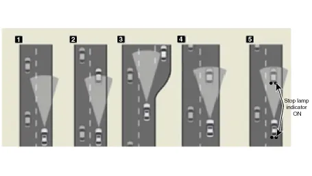 | 6. | Control and function on curves | (1) | The sensor may not detect a vehicle ahead or may detect a vehicle on other lanes because the detection range of the sensor is limited. |