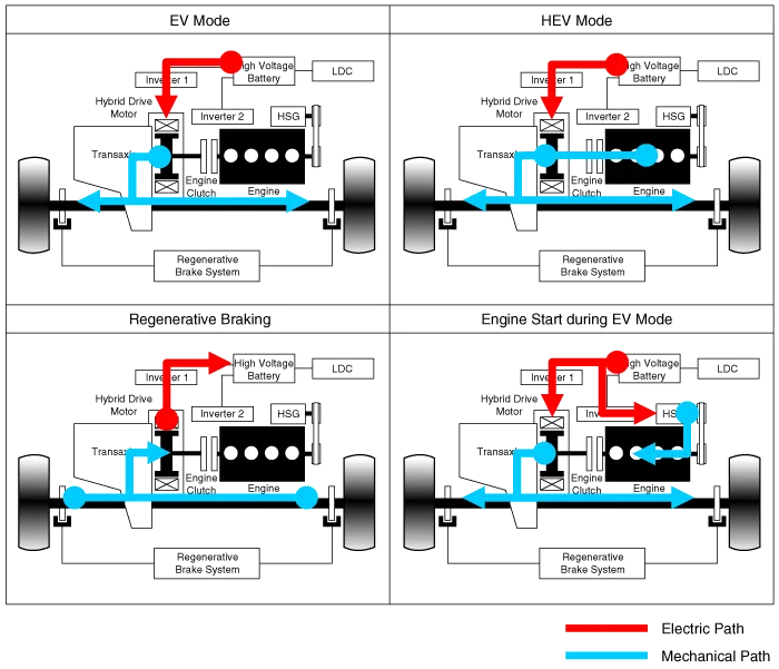 | The Hybrid Electric Vehicle (HEV) uses hybrid power source (Engine, Electric motor), so its fuel efficiency is relatively high and exhaust emission is very small compared to the traditional vehicle which uses only engine as power source. It consists of the engine, motor, high voltage battery and control modules. In Electric Vehicle (EV) mode, the HEV is driven by only the electric motor, but engine supports the motor in case the vehicle needs more power (HEV Mode). The electric motor not only drives the vehicle but also generates electric energy during regenerative braking for charging the high voltage battery. |