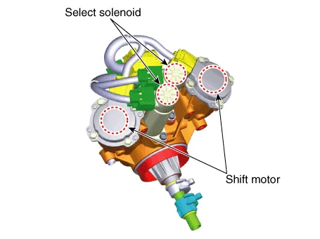 The gear actuator is comprised of the shift motor and select solenoid. Gear actuator shift motor and select solenoid receive signals from TCM to control the gear. |